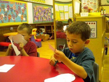 This class follows a curriculum which introduces phonics and whole language skills. Each week a new letter is introduced along with numbers, visual discrimination, science and health/nutrition. All children are encouraged to be able to print their first and last name using upper and lower case letters. Most other self-care skills have been developed at this time and they are working on tying & cutting. Children who have not been to school prior are also working on social and emotional development preparing for Kindergarten.